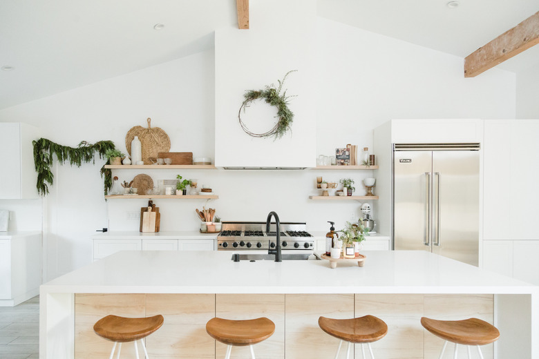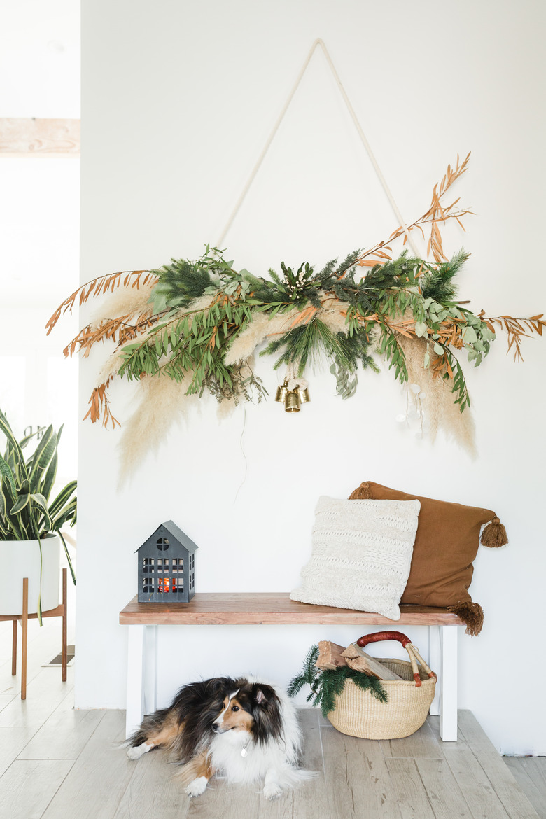 While it's not done — they still want to add backsplash, some hardware, and a pot-filler — it's functional. And there's Christmas to attend to, one of Thrane's favorite holidays. There's the gorgeous dried wreaths above the fireplace and in the kitchen. Seasonal buds from the property are in the bud vases above her bed. And a DIY branch that bridges one holiday — Thanksgiving — to the next.