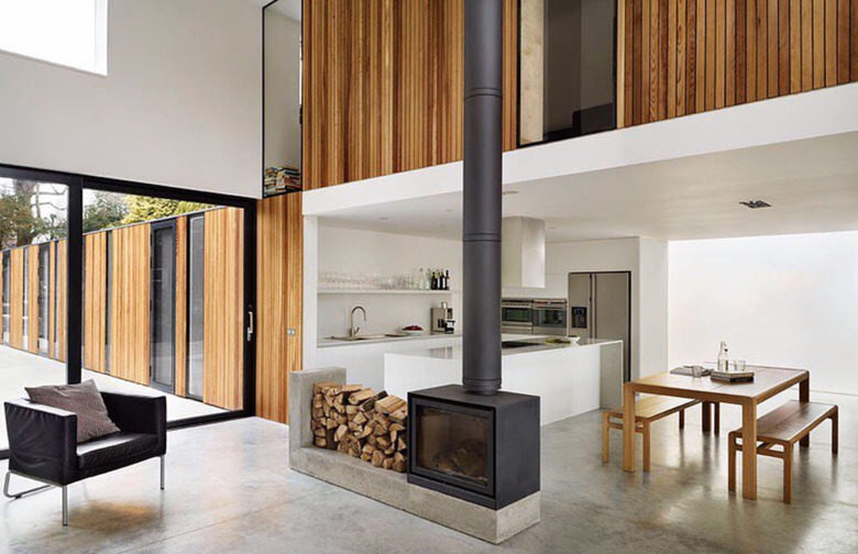 In this United Kingdom abode, Dan Brill Architects designed a custom concrete base to mount the wood-burning stove on, simultaneously providing storage for chopped wood. The sleek, modern fireplace acts as a room divider between the adjoining living area and kitchen, warming both spaces. Win-win.