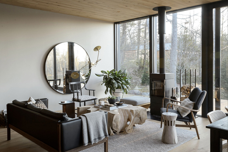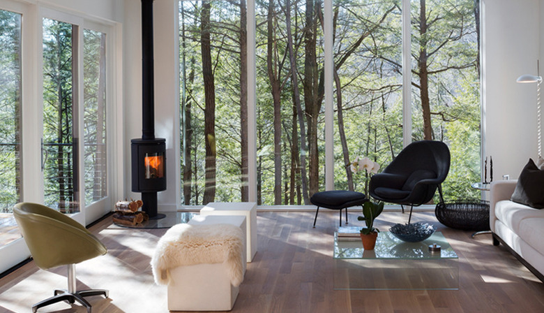 For the minimalist, or for those who are short on space, tuck a pint-sized stove out of the way like architect Marica McKeel did in this Kerhonkson, New York, pad. With floor-to-ceiling windows, this living room's miniature fireplace is seemingly set among the trees, nestled comfortably in the corner.