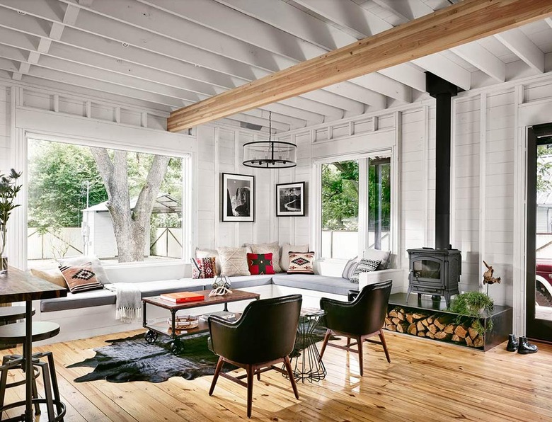 In this contemporary farmhouse designed by Austin-based Rauser Design, the wood stove fireplace is perched on a metal platform that's also used for storing chopped wood. The neutral backdrop of rustic, white-washed walls and natural wood flooring allows the black furnace and custom wood storage box to shine.