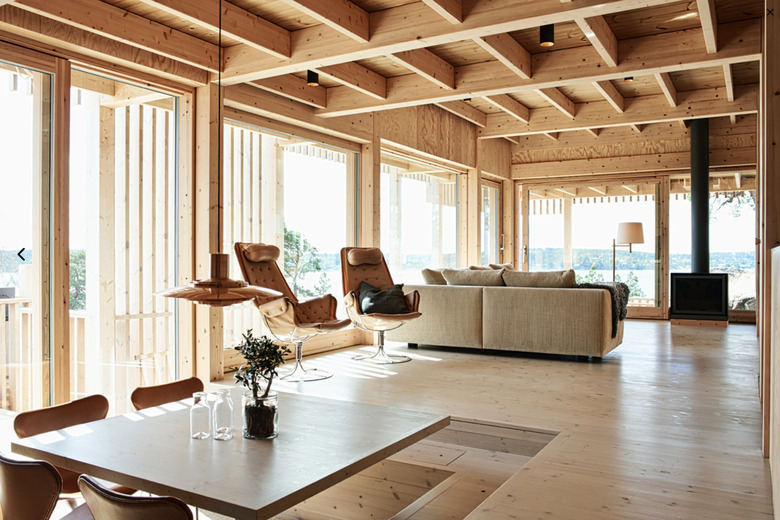 This eco-friendly Swedish beach house, dubbed Villa Moelven, was constructed purely out of wood provided by the Scandinavian timber manufacturer Moelven. The pared down design made up of raw wood coupled with floor-to-ceiling windows plays up the drama of the modern black wood-burning stove.