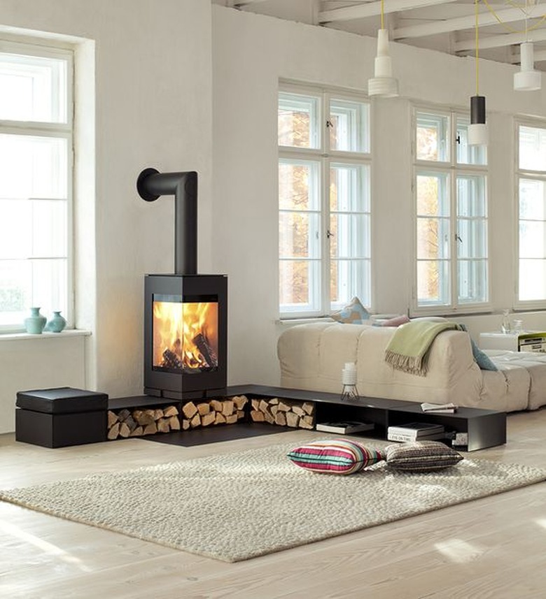 If you live in an open-concept space like a loft, a wood-burning stove can be used to help delineate specific areas. In this bright and airy industrial living room, a custom steel base doubles as storage for wood and a perch for seating.