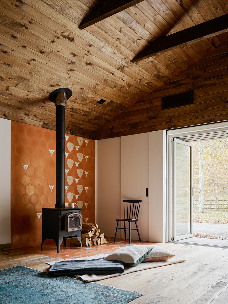 In this renovated horse barn in the Catskills, the architecture and design studio General Assembly gives special treatment to the wood stove fireplace by designing a custom backdrop with terra-cotta-inspired concrete tile. The dynamic feature — which is paired with crisp white walls and a rustic wood-clad ceiling — draws the eye to the corner of the sparsely decorated living room.