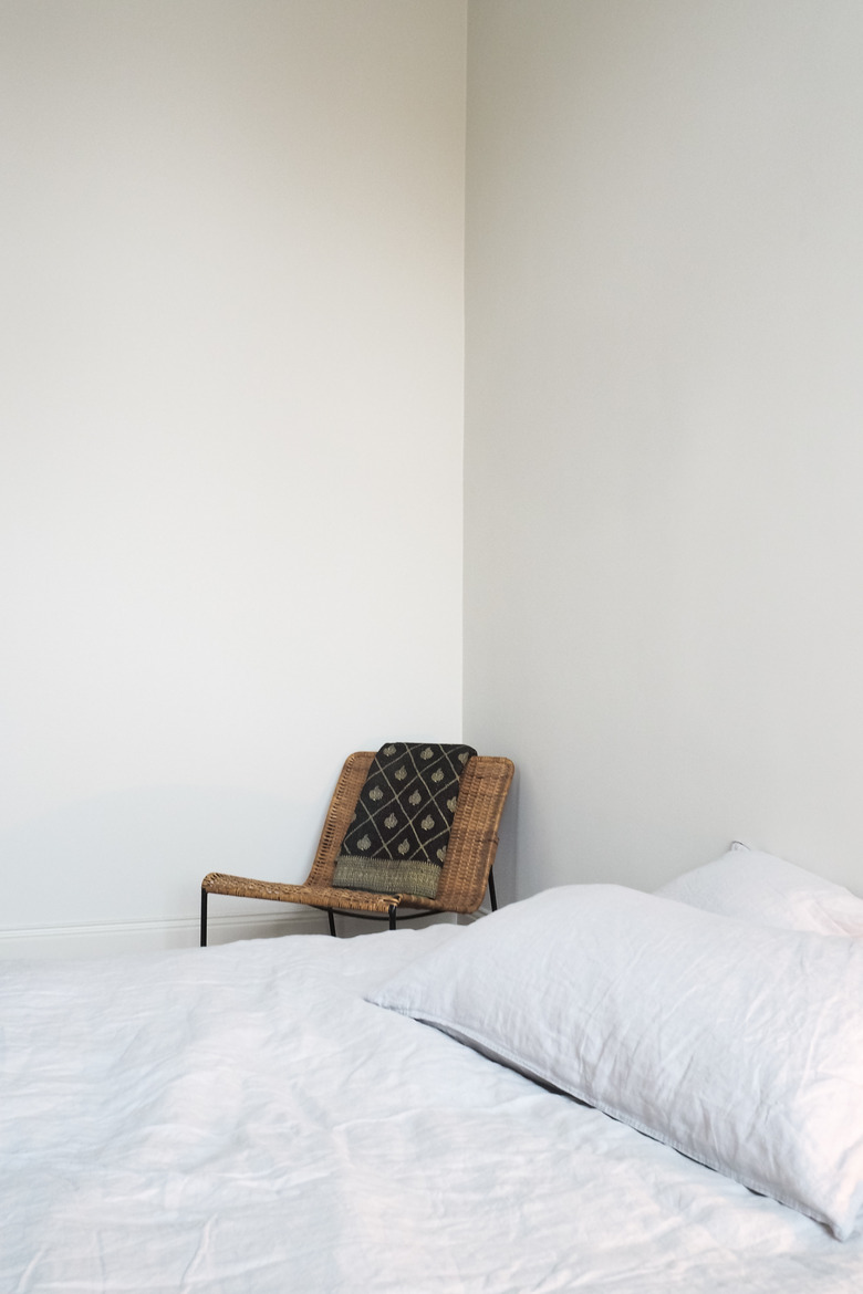 If you're thinking of making a space symmetrical, don't. A strong edit is required when it comes to getting wabi sabi right. Spaces should be free of clutter, imperfectly balanced, and as natural as possible — just like this stunning bedroom designed by Natalie Dubrovska.