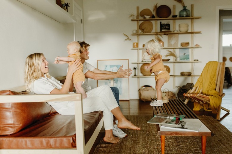 The 1,100-square-foot townhome has vaulted ceilings. "Our home was built in the early 1950s, so from the front yard's wooden fence design to the floor to the bathroom tile flooring, a bit of midcentury style is seen throughout the home," says Leah. The mustard blanket on the chair, from The Holidays, is by Kyst Collective.