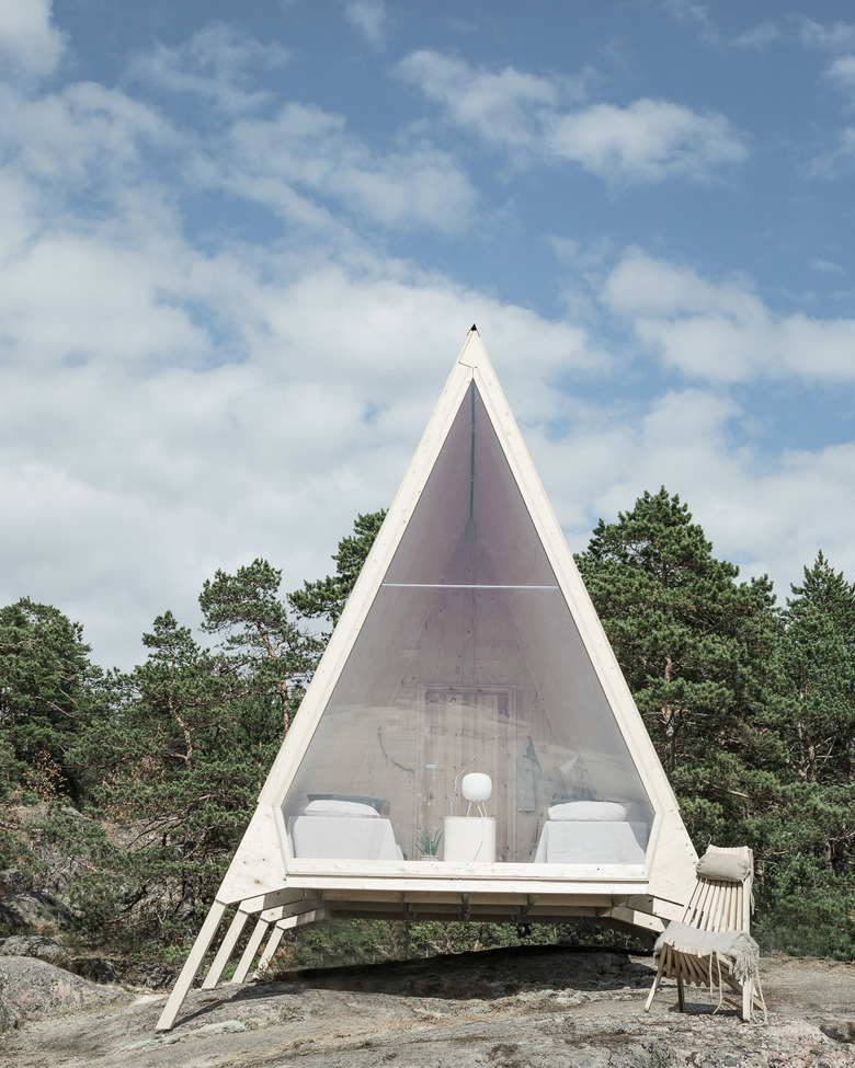 "The external materials used for the cabin includes a reflective aluminum sheet that helps to keep such a small cabin cool during the hot summer months," says Falck. The aluminum also acts as a mirror, reflecting the surrounding beauty.