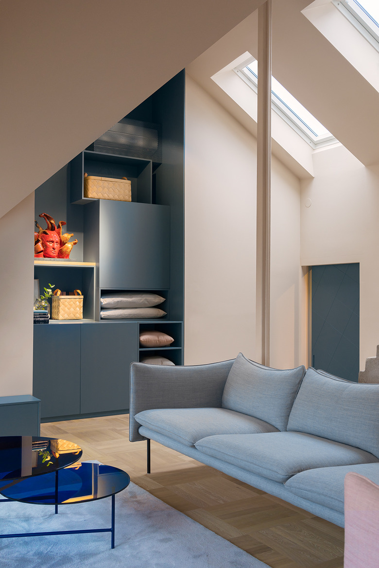 Cabinets and shelves were built into a niche in the living room, creating a space for storage and display while accentuating the space's high ceilings. Skylights illuminate the room's unfussy furnishings, which complement the blue design elements. The coffee table is a Note design.
