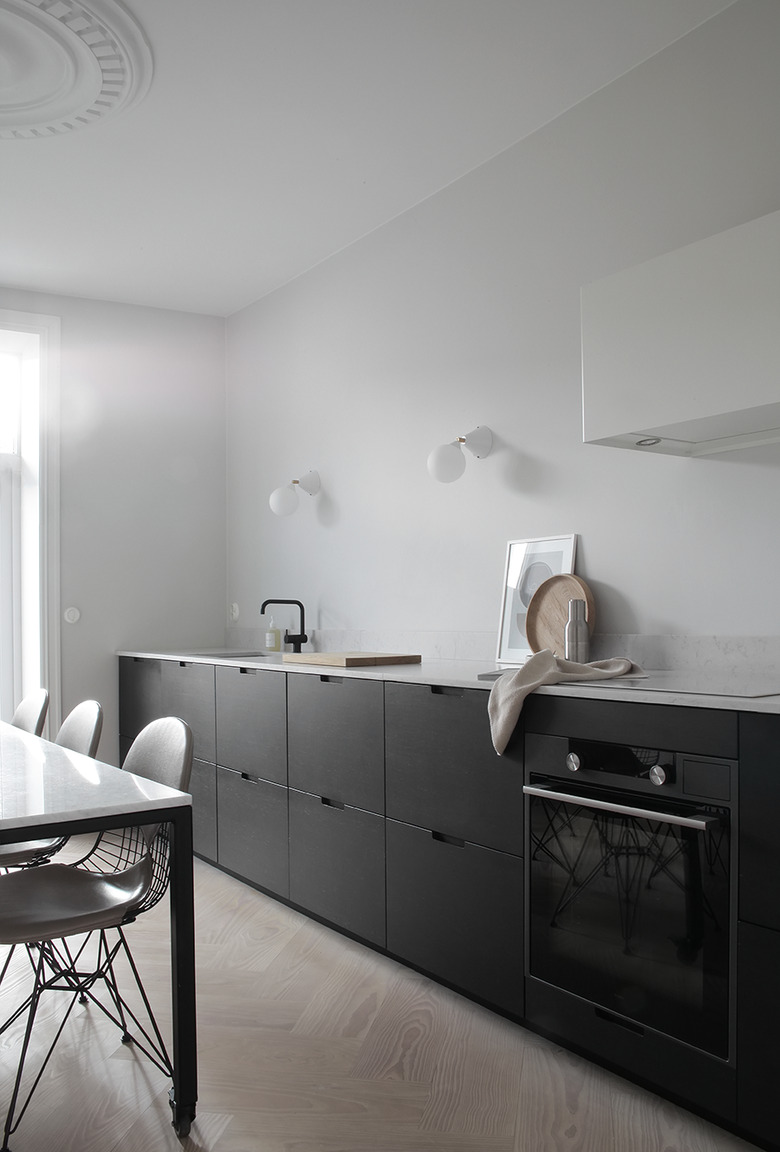 Cabinets without hardware work beautifully with Scandinavian minimalist interiors — like designer Elisabeth Heier's dramatic cook space — due to their seamless, uninterrupted appearance. And can we talk about those black cabinets paired with light wood herringbone floors? Swoon!