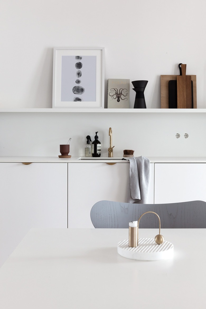 Or, follow the lead of the team over at Maly Krasota Design and go with an integrated handle — or a beveled edge at the top of the drawer or door — like they did in this minimalist kitchen. It's the perfect choice if you like the idea of a pull but don't really want to cut a hole in your cabinet door. Plus, you still get the ease of hardware with a look that's much more seamless.