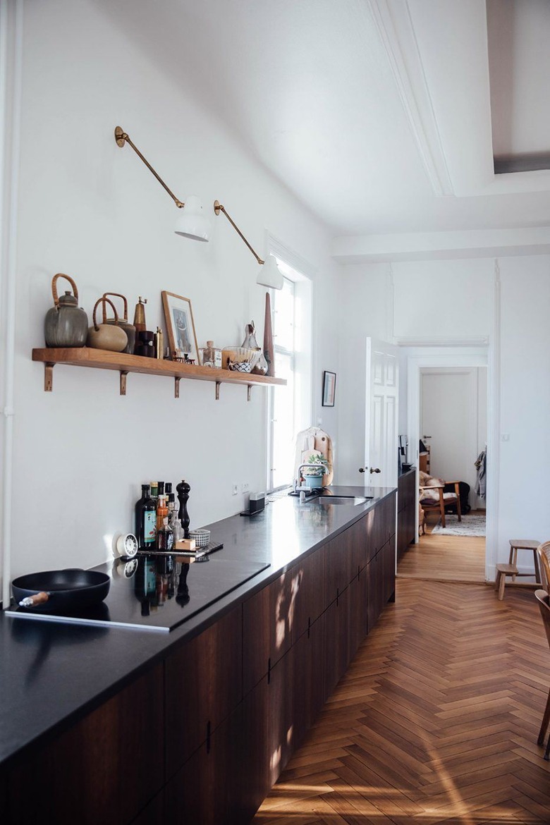 When you have dark wood cabinets this gorg you want as few interruptions as possible. Between the black countertops, chocolate cabinet finish, and herringbone wood floors, jewelry designer Anders Forup's kitchen is a culinary masterpiece. You hardly even notice the cutout pulls, which allow the beauty of the cabinets to take center stage.