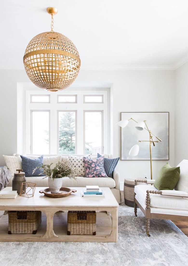 It can be a bummer if your living room doesn't have built-in shelving (otherwise known as a major space-saver). If you can't find room for a bookshelf or two, look elsewhere for storage opportunities. Can you buy a TV stand with cabinets? Stash a couple of baskets underneath the coffee table? That's what Shea from Studio McGee did in this living room. Plus, less clutter means your space will feel much larger.