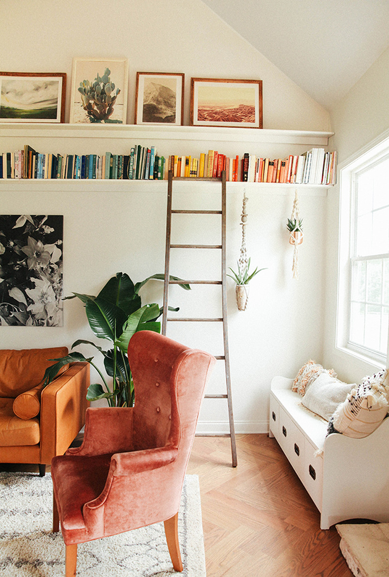 Bulky bookcases and small living rooms don't make good bedfellows. But that doesn't mean that your perfectly color-coded tomes should live out the rest of their days in boxes banished to the garage. Follow the lead of Anna from In Honor of Design, and utilize all of that empty wall real estate near your ceiling. It will draw your eyes up and free up valuable floor space.