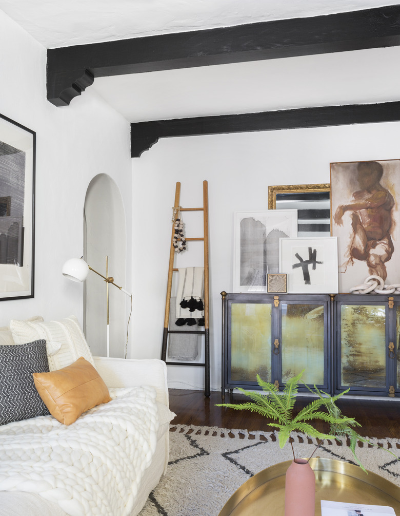 Drawing the eye up is a tried-and-true trick used by designers for decades, but there are always fresh ways to try this out for yourself. As a designer and prop stylist, Brady Tolbert has welcomed this look in his own living room. The layered artwork reaches toward the ceiling, and the ladder gives the space a tall appearance as well, while the black ceiling beams create even more visual interest, drawing the eyes up.