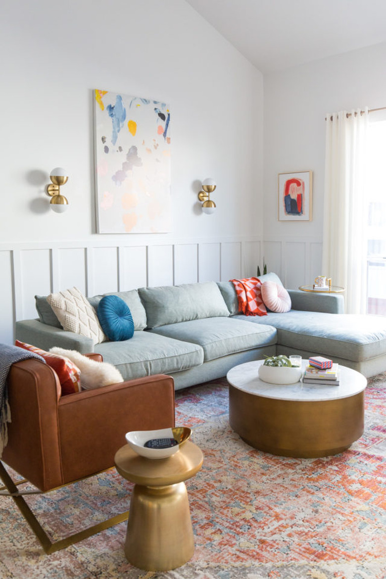 You may think that a tiny living room can't handle your passion for color, but we're here to tell you that's not the case. If you weave in carefully chosen hues, as opposed to every color in the rainbow, you can still achieve a vibrant and cheerful space. In this living room belonging to Ashley Rose from Sugar & Cloth, subtle shades are represented thanks to pillows, artwork, and an area rug.