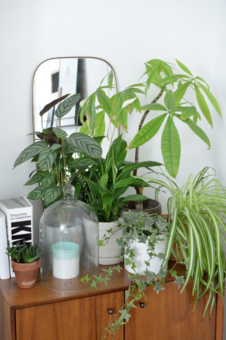 It can help to imagine the letter "A" when arranging a vignette featuring plants and other decor items. Place your tallest item at the top of the "A" to lay the foundation of your composition, and then add in items at varying heights while loosely keeping to an "A" frame as you arrange them. See how we've gathered the tallest plants in the center of the cabinet in the image above. Then we simply added in smaller plants, books, and personal items on each side to create interest at different levels.