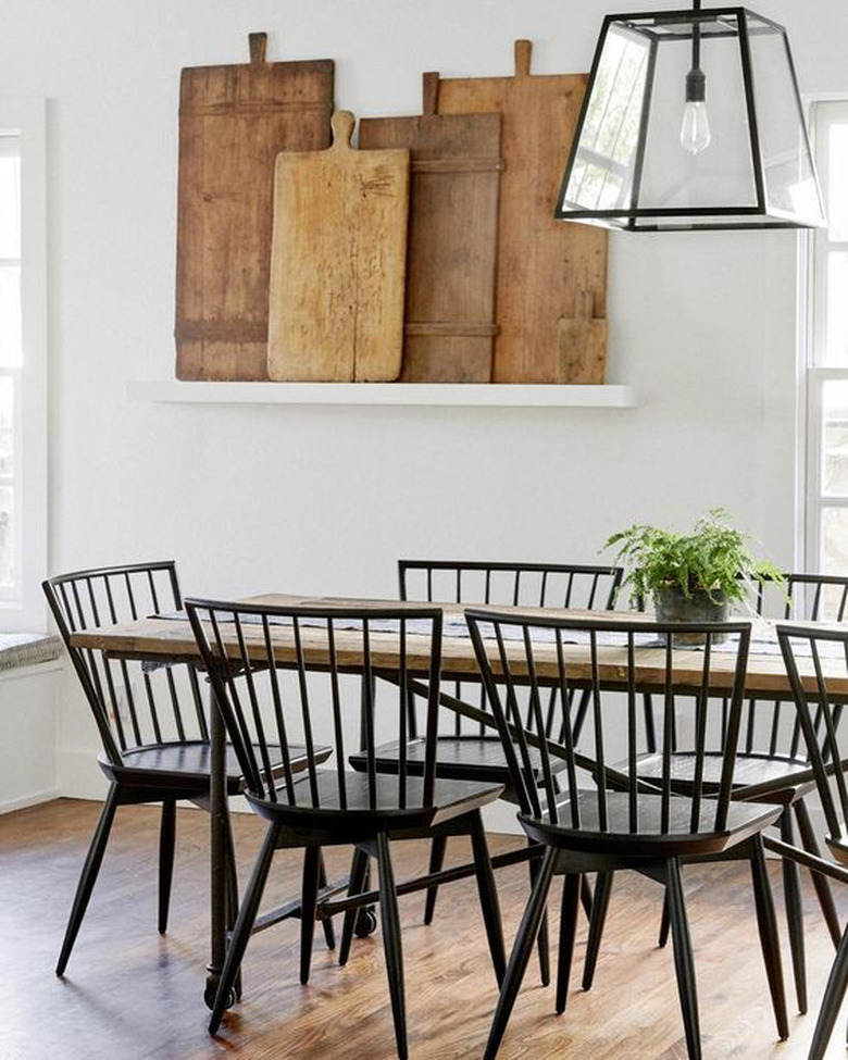 In this modern dining room idea dreamed up by CC and EM Interiors, rustic wood chopping boards and Windsor chairs add dreamy farmhouse charm. And don't even get us started on that amazing pendant light.