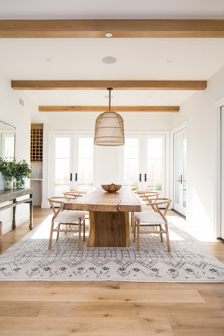 This modern farmhouse dining room designed by Sita Montgomery is lovely and uncomplicated with a hint of boho thanks to a woven bell-shaped light fixture, natural materials, a patterned area rug, and a live edge dining table. It can be effective to decorate with accents that are as simple as they come.