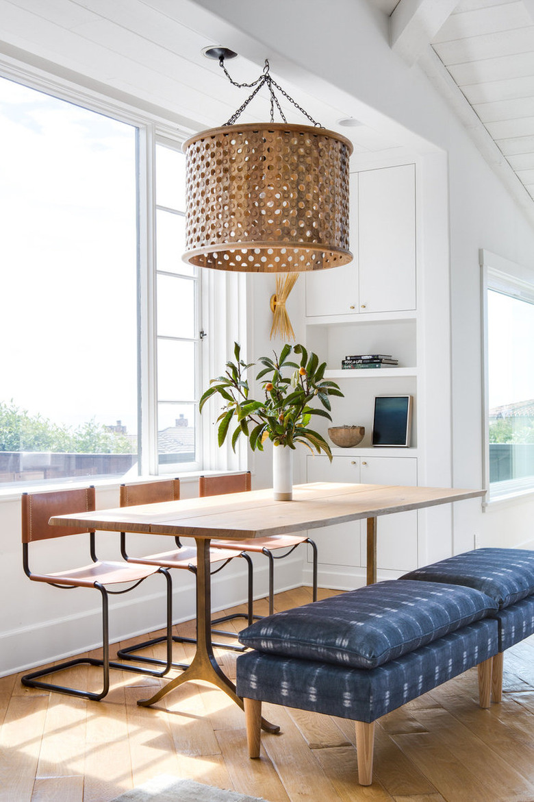 Don't be afraid to incorporate a variety of finishes and materials in your dining room. This space captured by photographer Chad Mellon does just that with a bronze light fixture, black steel-frame chairs, and a shibori bench with wooden legs.
