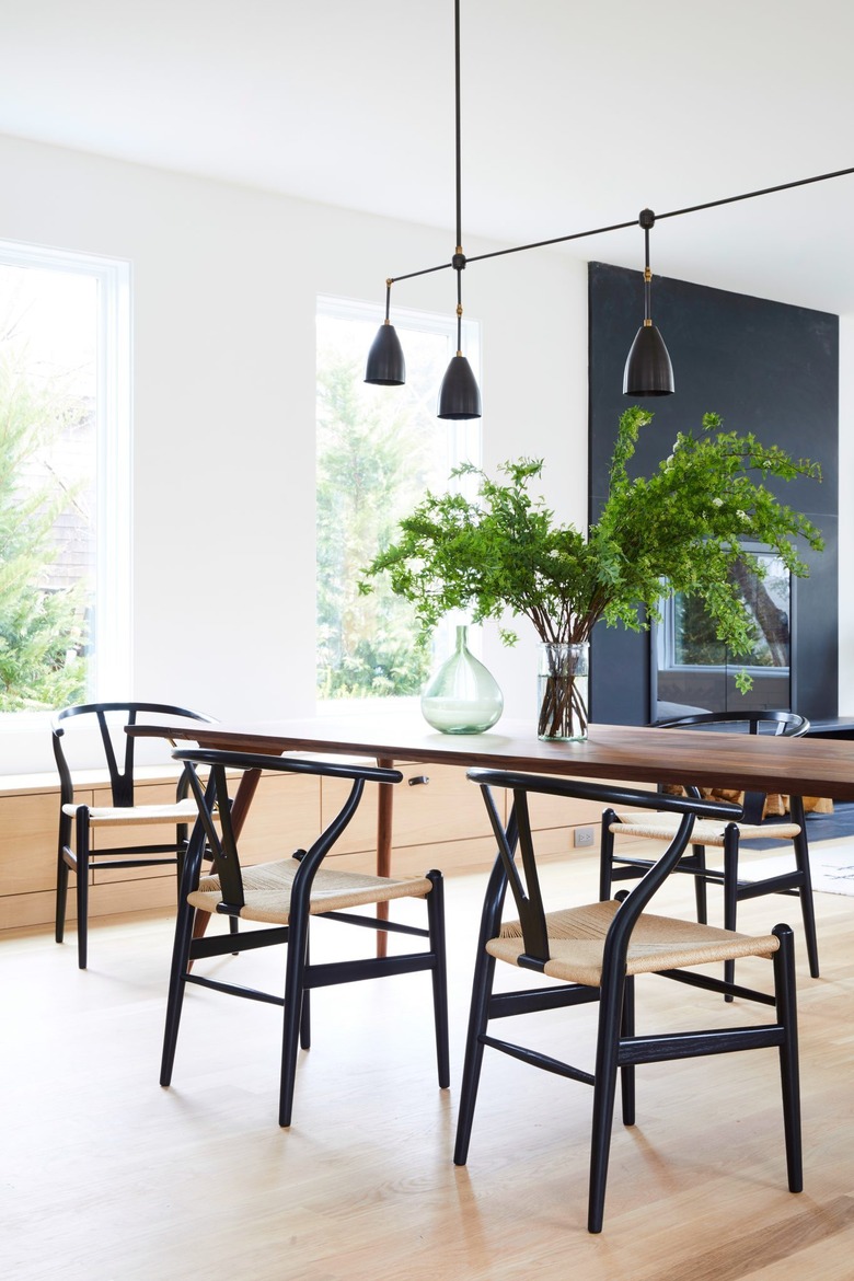 Think linear when it comes to your modern dining room. This space designed by Jessica and Christina of Ronen Lev is a study in sleek lines, with its crisp black Wishbone chairs and elongated light fixture.