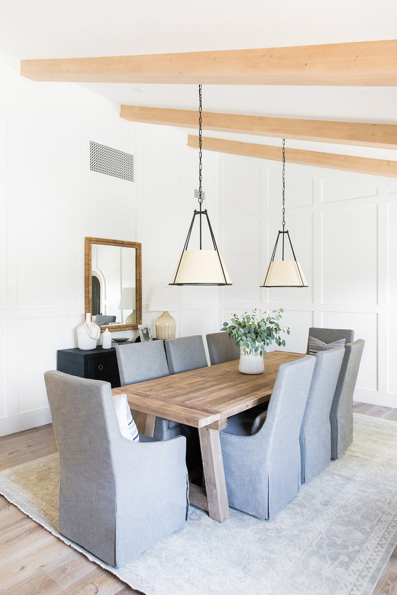 Shea from Studio McGee has this modern farmhouse thing down pat, which you can clearly see in this elegant dining room. Follow her lead and select fresh, neutral pieces like a whitewashed area rug, a light wood dining table, and gray upholstery.