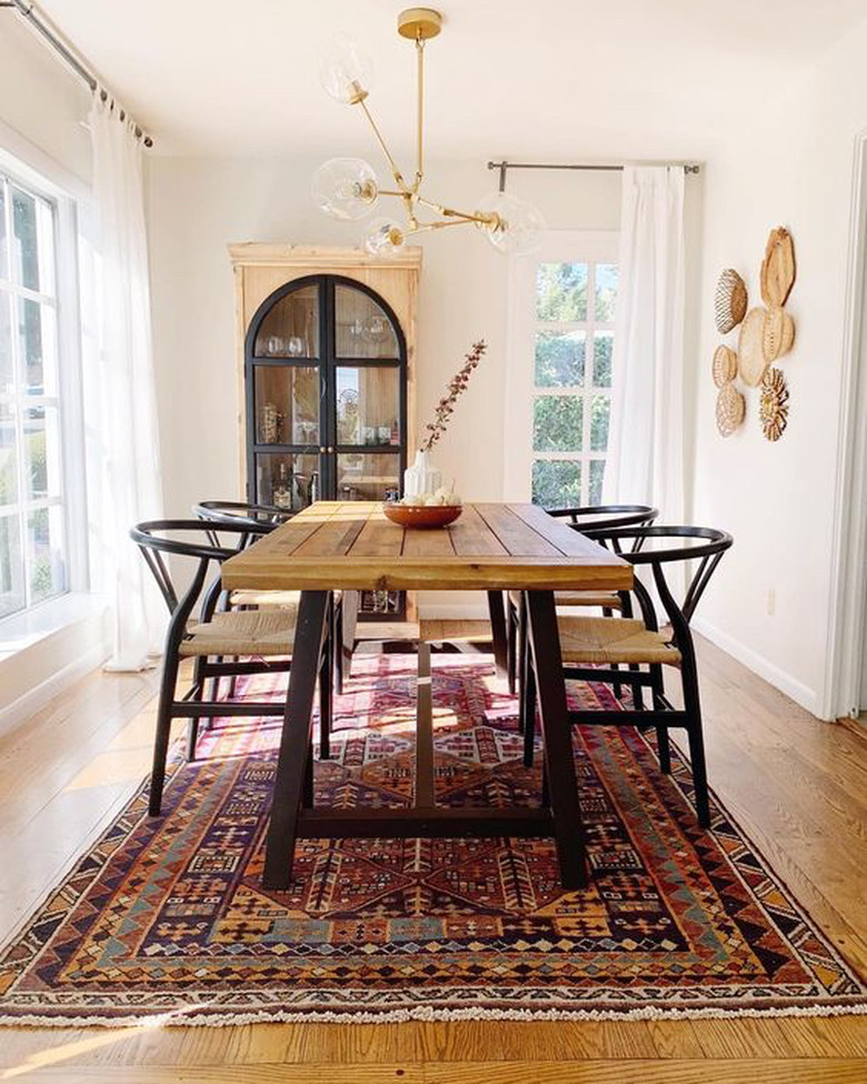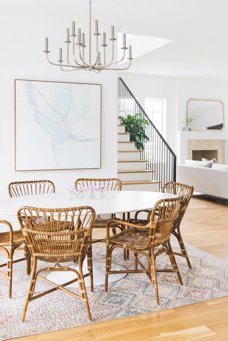 We love this modern dining room idea designed by Melissa Lenox, complete with boho-chic rattan chairs and a kilim rug. And yet, with a traditional light fixture and airy surroundings, the space still exudes a farmhouse spirit.