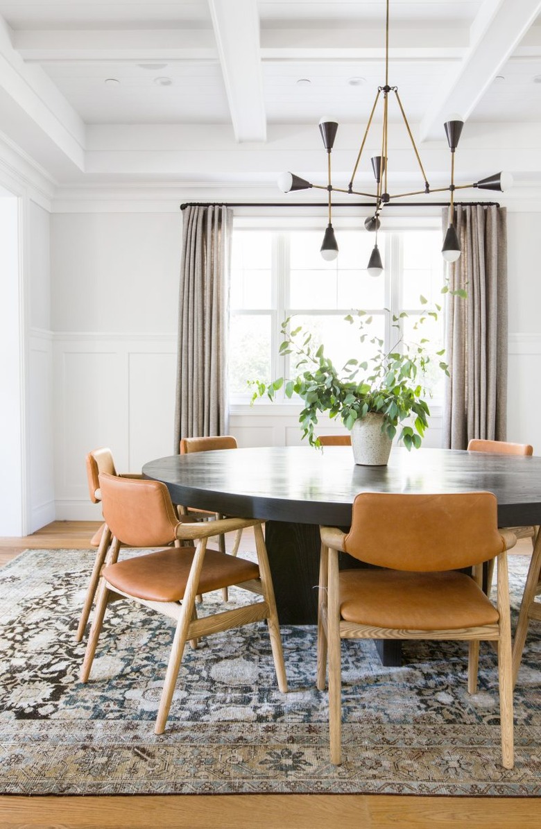 This modern dining room idea designed by Amber Lewis is simple yet effective. She mixed vintage-inspired decor, like these leather cognac chairs and area rug, with bright white walls and an ultramodern light fixture.