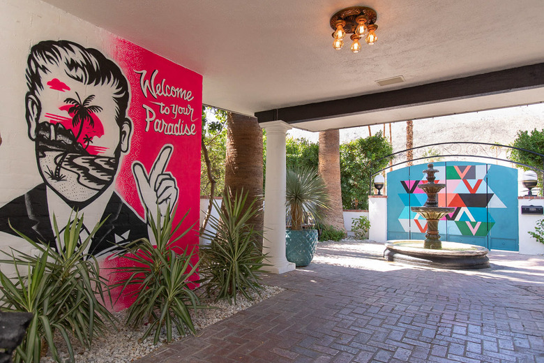 A graphic, spray-painted sign that reads "Welcome to Your Paradise," created by Los Angeles tattoo artist and muralist Sagent Staygold, greets guests upon arrival.