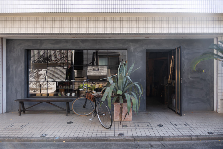The dark-gray façade contrasts with the building and sidewalk's white tile. Niizeki used brass accents for the signage and door handle.