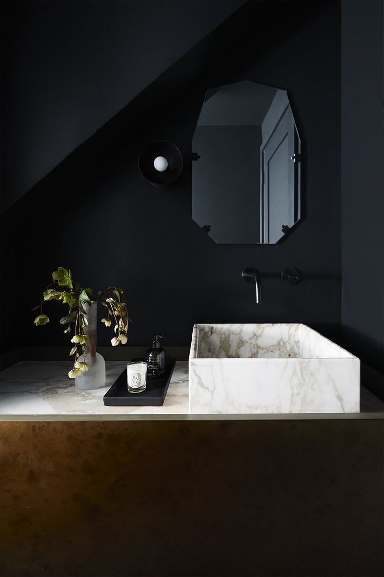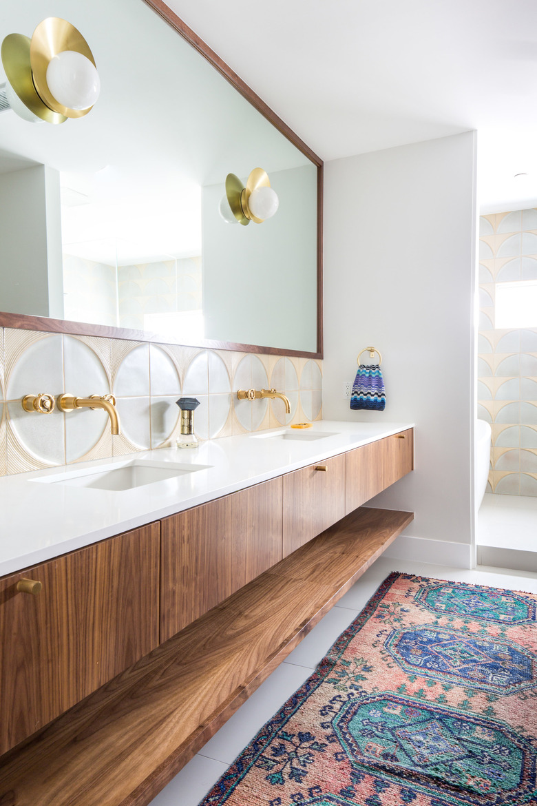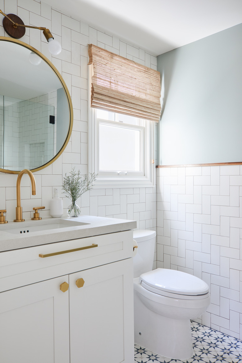 "Don't be afraid to mix metal finishes for your plumbing fixtures and cabinetry pulls in one space. I would stick to only two different metal finishes though in one room. Since not all plumbing brands make an entire suite of fixtures in the one finish you like, it's OK to spend the bigger bucks on higher-end brands and finishes like matte black or satin brass on the sink faucets that you and your guests will be looking at most often and go more standard chrome and middle-grade on the shower and tub faucets that won't be as public." — Natalie Myers, owner/principal designer at Veneer Designs