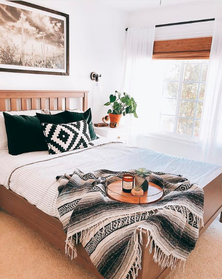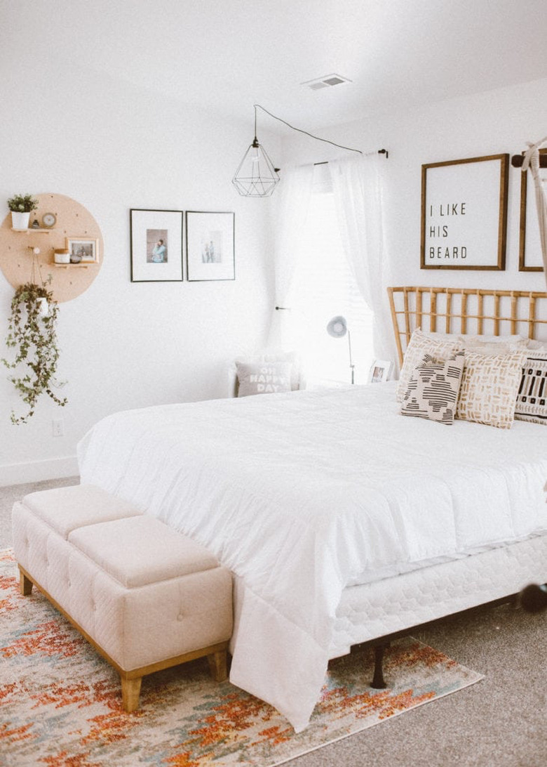 A multitude of textures and materials are showcased in this modern chic bedroom belonging to Jess from Positively Oakes. From the rattan headboard to the cage pendant light to the round pegboard, there is more than enough eye candy to go around.