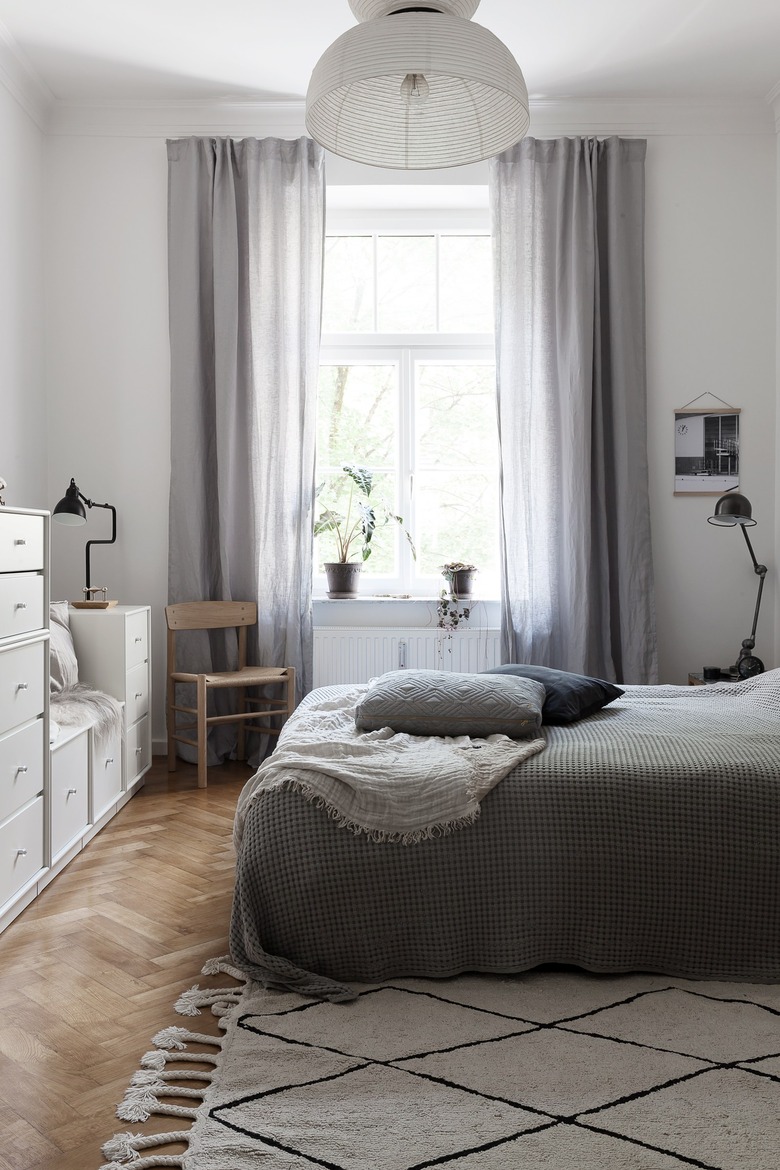 Modern chic bedrooms always seem to have a flawless color palette, one that displays shades that are personal to the homeowner. In her bedroom, Sarah of Coco Lapine Design chose bedding and drapery in dreamy shades of gray, which pair beautifully with the white and black contrasting accents throughout.