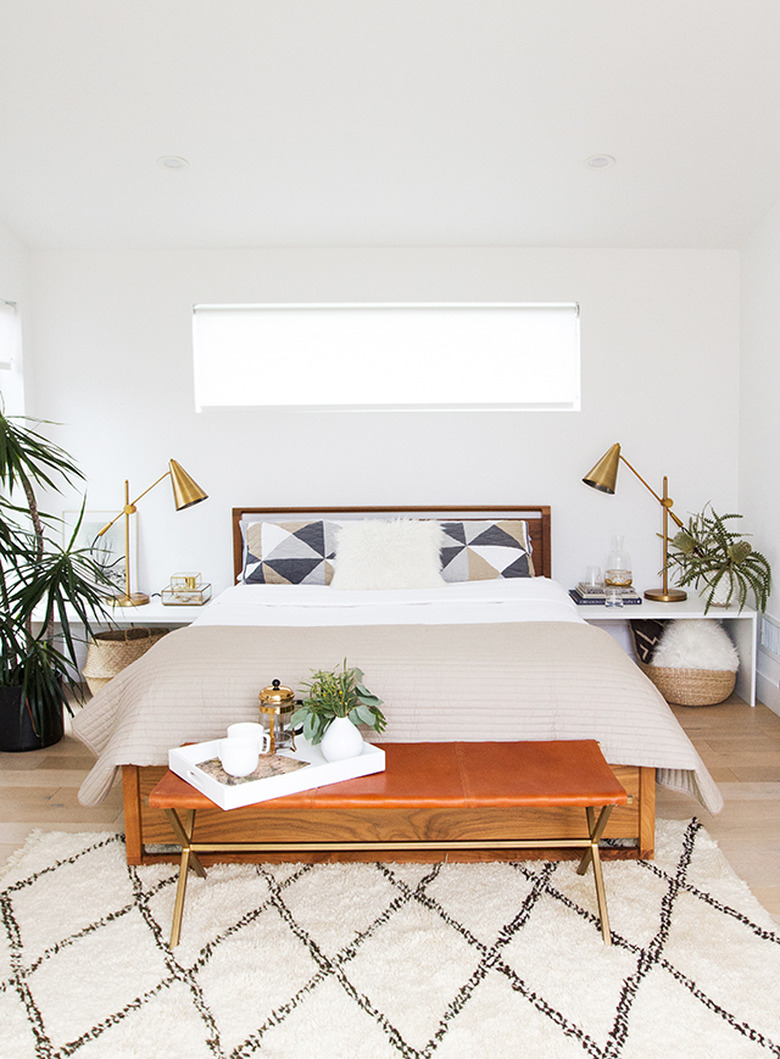 Look to your travels, or places you wish to travel, for inspiration when designing your modern chic bedroom. In this space designed by Sarah Sherman Samuel, geometric patterns, tropical foliage, and woven baskets infuse gorgeous global style.