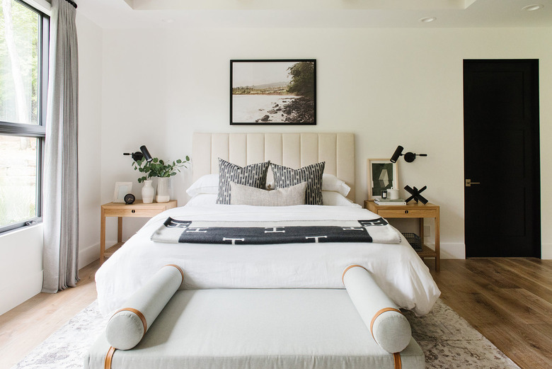 In this lake house bedroom crafted by Shea from Studio McGee, modern styling is communicated with clean lines. The channel tufted headboard, throw pillows, furniture, and even decorative items work well together to create a balanced and tranquil vibe.