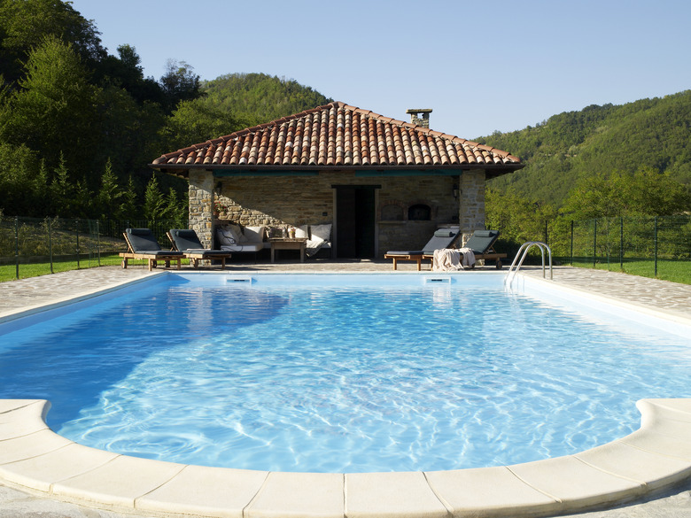 For a modest home, a pool house may be a prefabricated shed from a home-improvement store and repurposed for poolside use. Some companies also sell wooden cabin-style structures designed as pool houses. These usually offer just one room and may be shaped like a shed, but with windows and a home-style front door. These look like miniature cottages or tiny homes. This small type of pool house probably does not include a shower or running water, unless the homeowner customizes the space to include these features. In either case, a well-planned pool house also has a paved area leading to the pool to prevent tracking dirt, grass and debris to and from the pool.