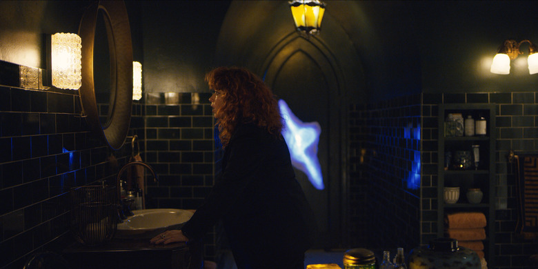 MB: It had to read as an art piece, but we also wanted it to be ominous and just really like, "What??? What is this thing??" The script kind of described it as out of the door, and papier-mâché/crafty. I don't know why I was just drawn to it being more galactic, more space, more void. And there was the challenge logistically: How do you have an operating door that goes deeper than the thickness of the door? And so it was built from scratch ... it's just a bunch of layers of ripped wax paper. It's really simple; it's the reflection off the tile that really makes it amplified.