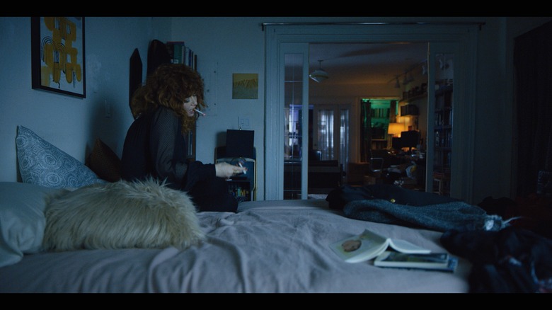 MB: Yeah, the tiles are green, which I picked to contrast with [Natasha Lyonne's] hair ... a lot of the reviewers are calling it black, but I think that's just because the light of the door makes the green look black ... I wanted [the bathroom walls and tiles] to be dark, and honestly that really came as a contrast to [Natasha's] hair. I wanted her to really pop in that bathroom and not in a typical way.