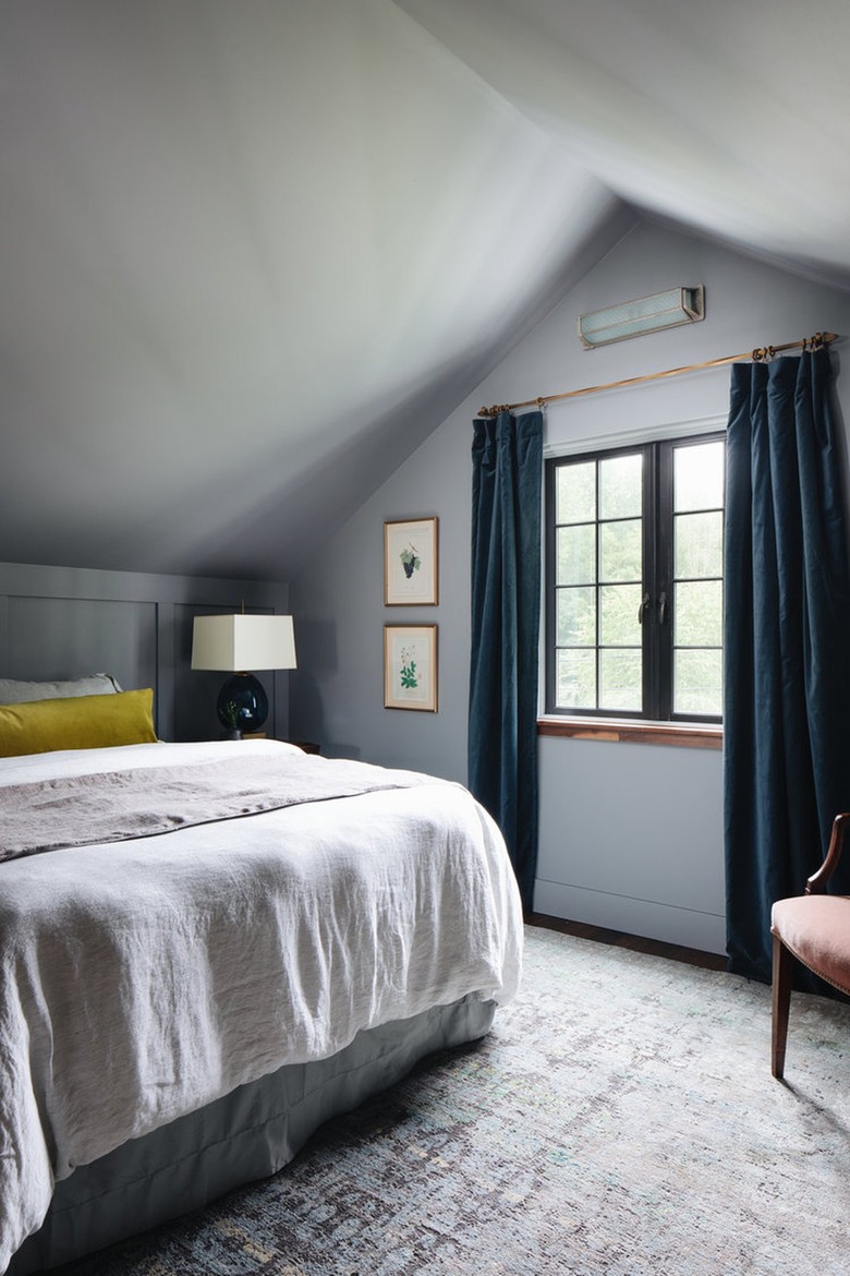 Vintage bedrooms are the perfect opportunity to show off fancy drapery. From intricate patterns to elegant fabrics to decadent colors, there are no limits. In this sophisticated design by Jean Stoffer, the navy blue velvet curtains hung from brass hardware scream luxury. Not to mention, the dark color and heavy material will do wonders blocking out the sun when you're trying to catch a few extra zzz's.
