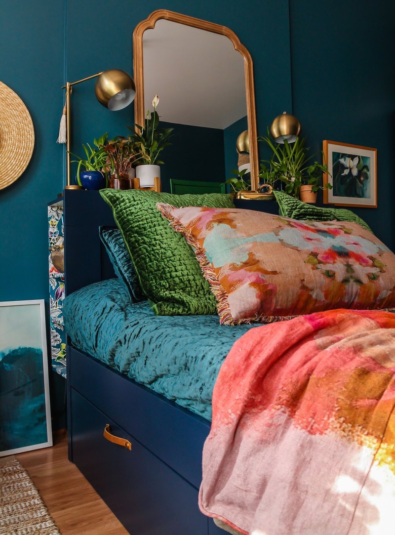 If you're considering a dark bedroom, make sure there is plenty of natural light to counteract the dramatic hue (or in this case hues). This gorgeous bedroom belonging to Megan of TFDiaries features a saturated combination of jewel tones — hello, teal paint color! — on both the walls and the bedding, but still looks inviting thanks to the warmer pops of color throughout.