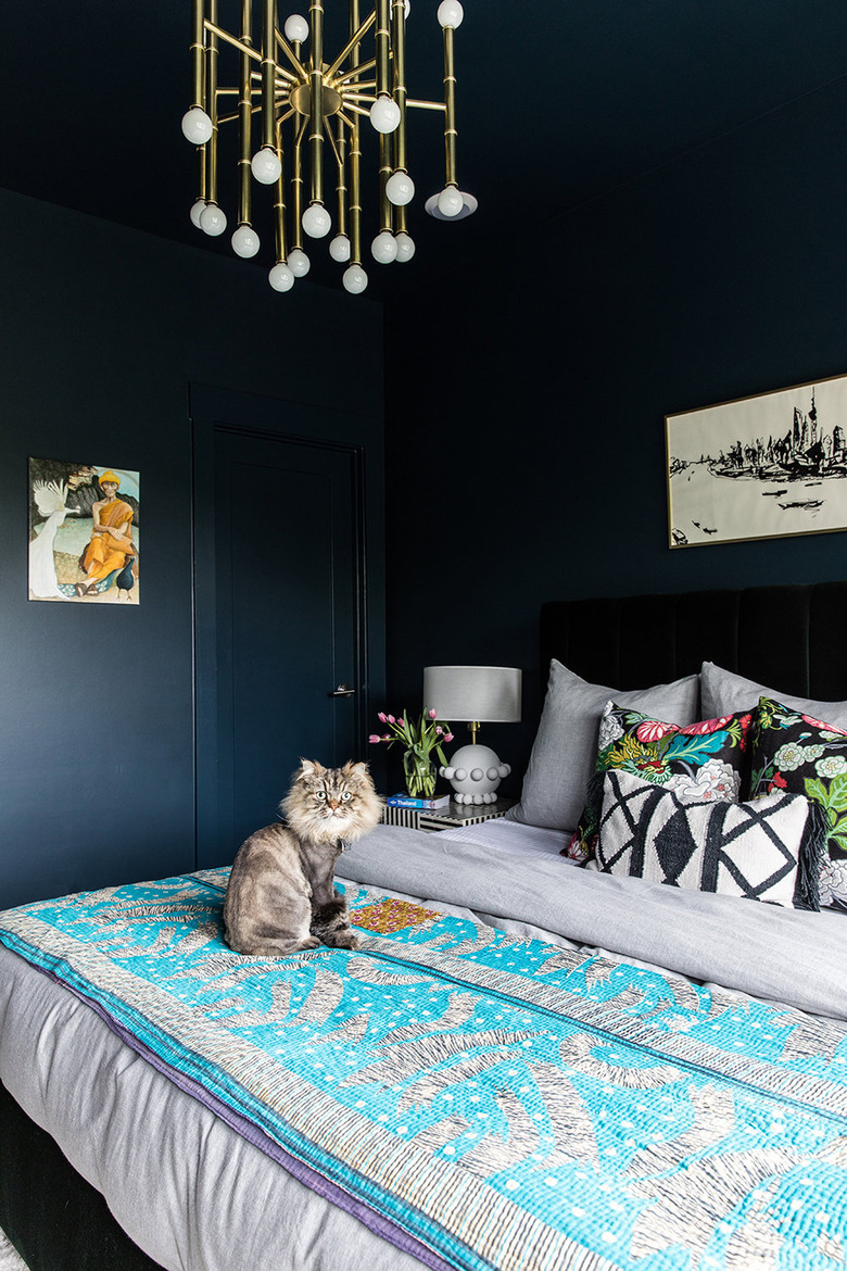 A deep, blue-black paint will bring all the glamour to your bedroom, especially when paired with brass details and luxe fabrics. In this bedroom by House of Nomad co-founder Kelley Lentini, the moody vibe of the inky walls, ceiling, and even the door sets the scene for the rest of the bedroom. She completed the look with a velvet channel-tufted headboard and textiles that reflect her eclectic eye. We've got just one question: Can we keep the cat?