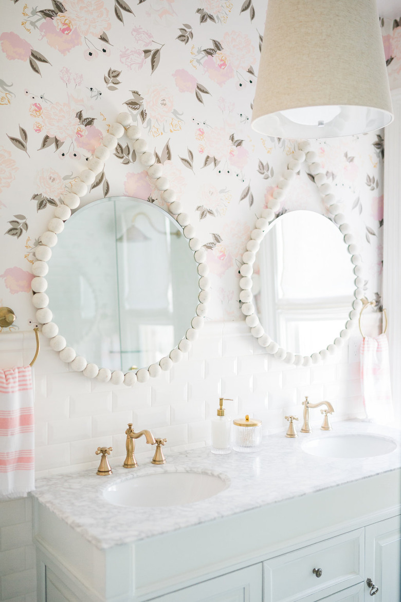 Pastels have a way of bringing a dreamy look to any space, and it feels particularly enchanting when it's represented through delicate, fanciful florals. This bathroom belonging to Leslie of The Leslie Style is a ladylike masterpiece, and we can't get enough of those beaded mirrors.