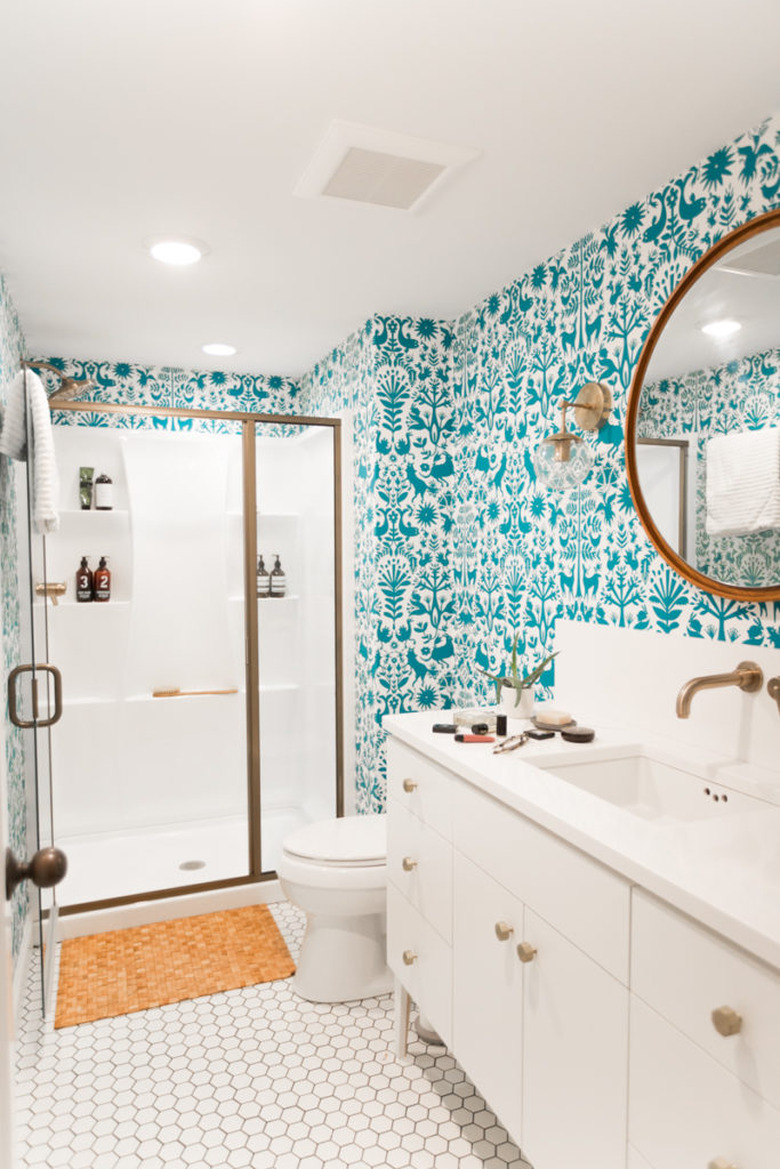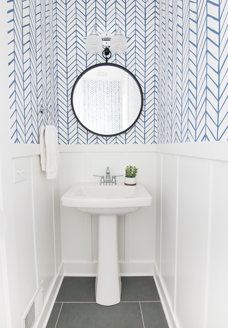 If you're dreaming of a cottage-by-the-sea look for your bathroom, opt for a light wallpaper print that showcases shades of blue and white. Kelly from The Lily Pad Cottage captures that waterfront vibe beautifully in her lake house bath, with a wallpaper that's equal parts geometric and breezy.