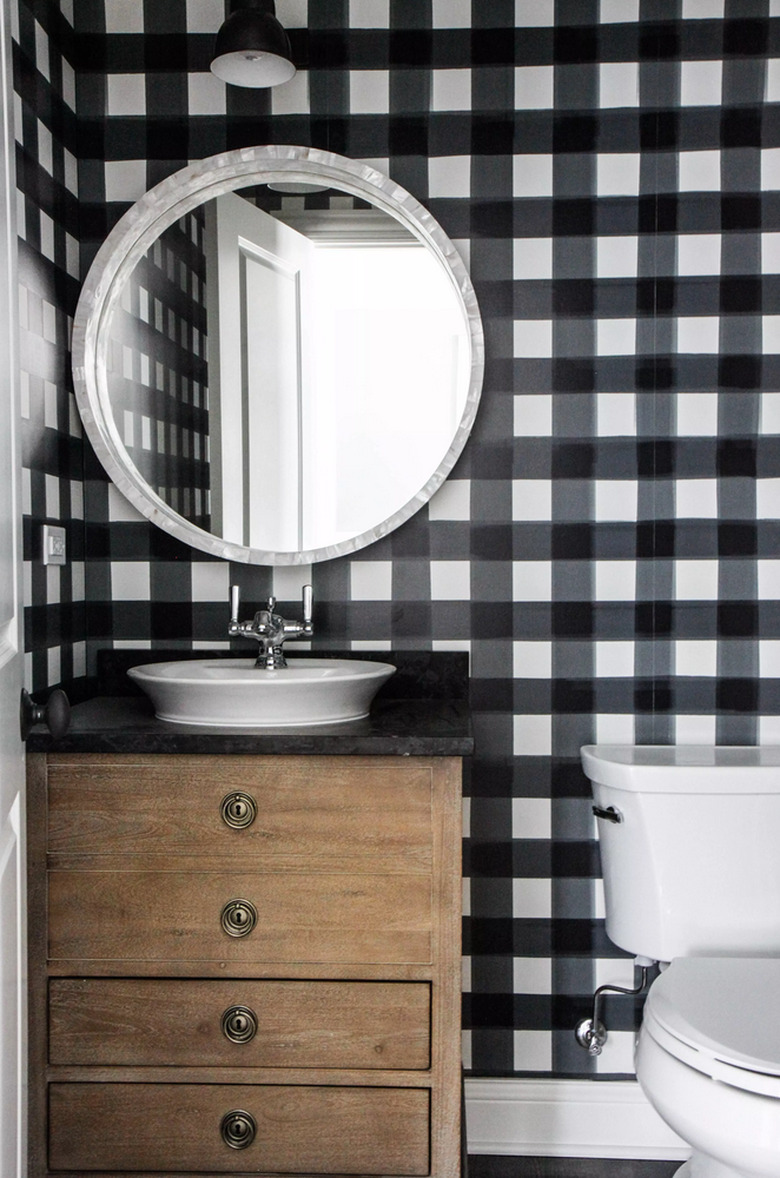 Plaid wallpaper is gaining steam (it's frequently seen in the Joanna Gaines universe), and we're loving it for its laid-back, farmhouse charm. Here, in a bathroom styled by the team over at Park & Oak Interior Design, the patterned wallpaper makes quite the impact when paired with tried-and-true design choices.