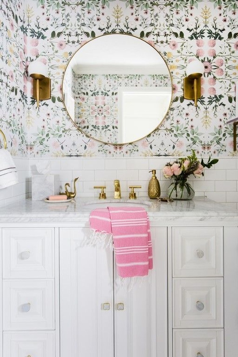 To really show off your personality, choose a wallpaper that looks like a shirt you'd pull right out of your closet. Ashley of At Home with Ashley picked a wallpaper for her bathroom that reflects her favorite colors and aesthetics, creating a feminine space that feels like spring year-round.