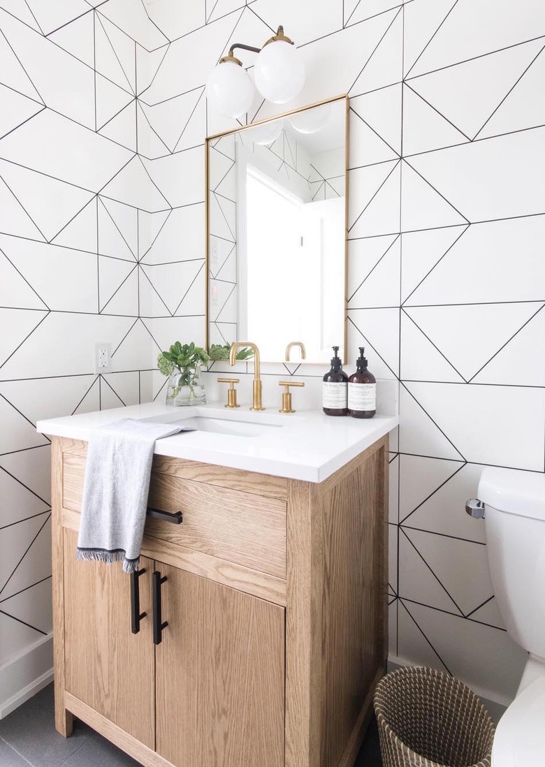 You don't always have to go the uber-patterned route with your bathroom wallpaper idea. In this space designed by Leclair Decor, a geometric print makes a minimal, yet stunning, statement.