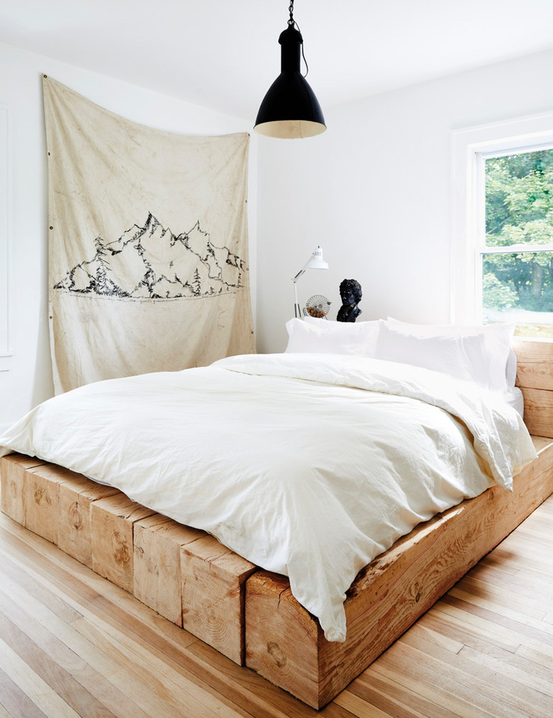 We love small spaces for their inherently cozy feeling. Portland-based designer extraordinaire, Jessica Helgerson, maximizes limited space in this petite bedroom by creating an arched headboard out of utilitarian and attractive built-in cabinets. The tufted velvet material is the perfect soothing backdrop to lay your head, and an ikat bedspread and Turkish rug add warmth and color.