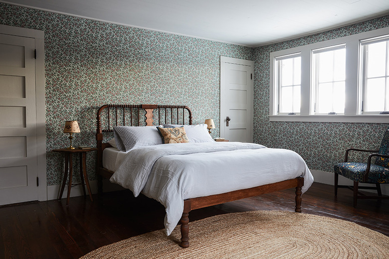Whitewashing or limewashing is a process that uses water, salt, and limestone to give walls a patina or aged look that still feels fresh and clean, but adds dimension. This cozy bedroom idea designed by Leanne Ford employs the technique flawlessly, imparting a cloud-like feeling in the space, while stone flooring creates an English cottage vibe adding character to the muted color palette.