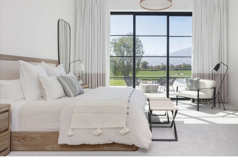When you have an amazing view, make it the focal point of your room by framing it with oversize sliding doors, as Studio Life.Style did in this sophisticated, all-white bedroom. The neutral color scheme allows the outdoors to take center stage, while a layered mix of oversize pillows and textured blankets create the bed of our dreams. Wood furniture and a woven pendant light (just out of view) add a hint of warmth.