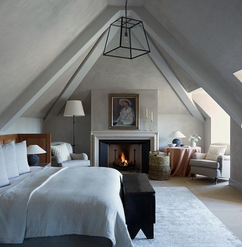 It's hard, no, impossible, for us to resist a bedroom with a fireplace. This beauty is located outside London in Heckfield Place, an 18th-century Georgian estate that was thoughtfully restored as a hotel by Ben Thompson. He perfectly evokes that old world charm with limewashed walls, curated furniture, period artwork, and a bed full of pillows — this is a cozy bedroom idea we would never tire of.