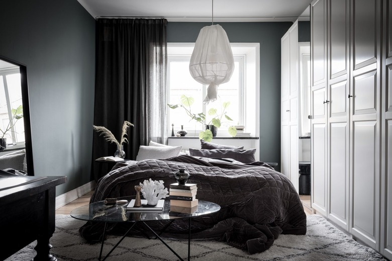 The dramatic floor-to-ceiling drapery framing the bed in this gray bedroom, designed by Emma Fischer from Emma Hos, adds oodles of height and drama. The woven rug, blankets, and pendant light add visual warmth and texture to the space, while the green plants provide a welcome pop of color.