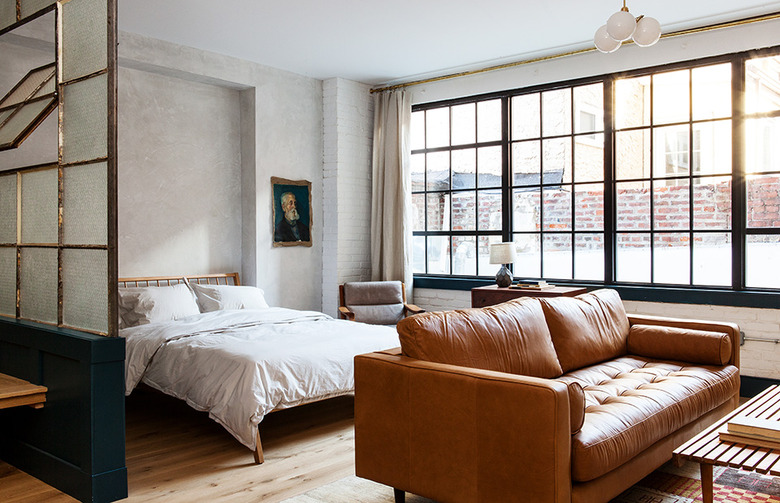 Vintage items add depth and soul to a room that just can't be achieved with something new. The team over at Jersey Ice Cream Co. captured that cozy bedroom idea beautifully in this hotel guest room. The walls add plenty of texture creating a warm and inviting space rich with character. A unique brass chandelier along with, industrial steel frame windows, and one-of-a-kind artwork create a happy and thoroughly welcoming retreat.